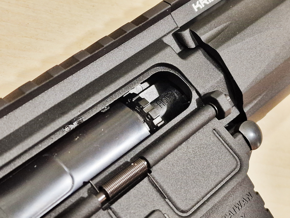 Once the bolt recoils, the hop-up dial is exposed and fixed, and the bolt release lever rises. This makes it