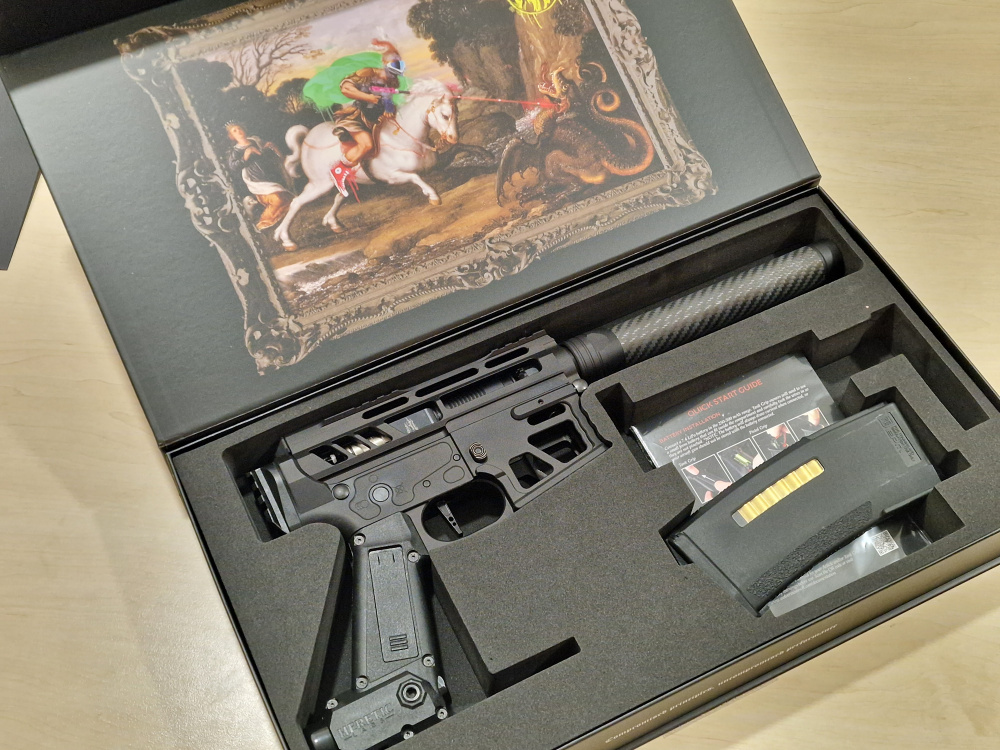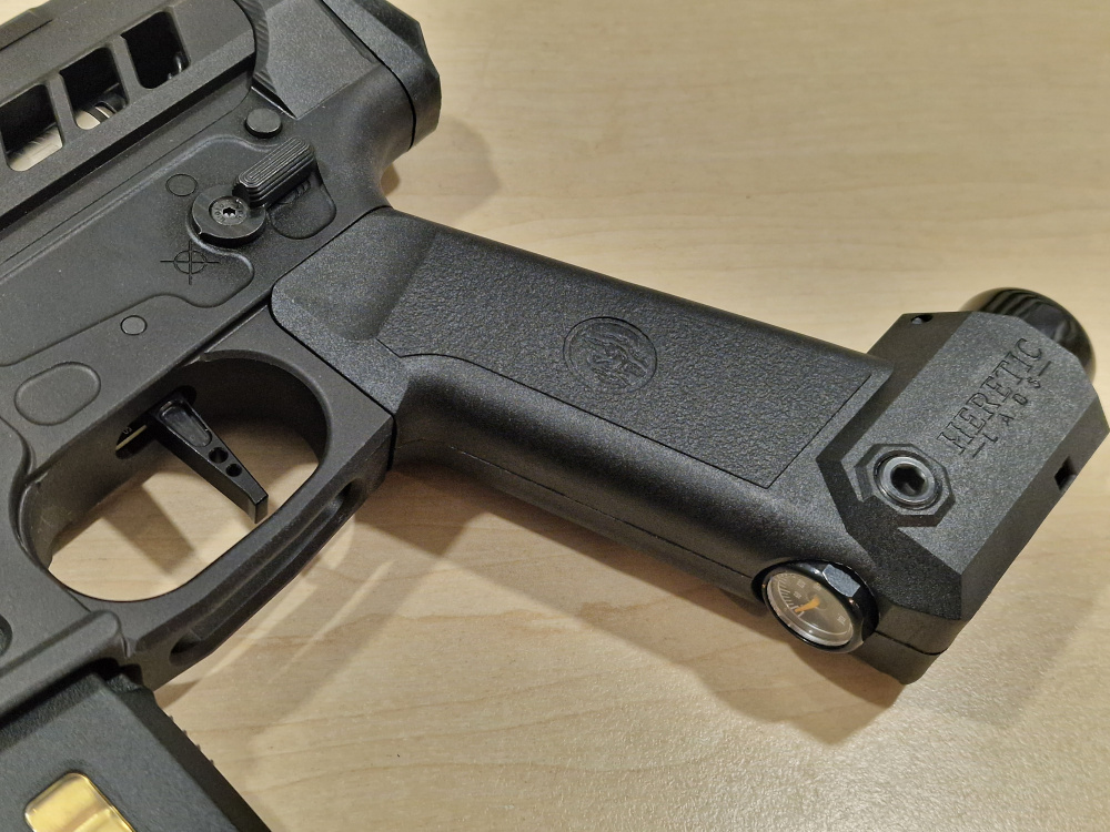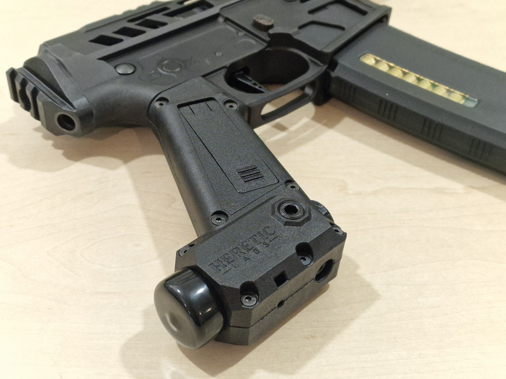 Heretic Labs proposes the 2nd chapter in speedsoft performance. The Article II is the ultimate untethered HPA weapon for the player demanding range, shot consistency, and unmatched durability. The molded glass filled nylon tank grip and skeletonized CNC billet aluminum receiver brings a new level of dependability to the classic speedsoft form factor. The intrinsically aligned 8″ barrel balances efficiency, size, and weight with genuine carbon fiber. The Heretic Labs Tank Grip includes the lightning-fast and industry leading STORM Category 5 Regulator. Of course the Article II could only be powered by the award-winning independent poppet and nozzle technology found in the INFERNO Gen 2 HPA engine. The HPA engine is controlled by the Spartan Electronics Control Board with 5 unique fire modes, including binary, all unleashed at the touch of an incredibly smooth trigger.