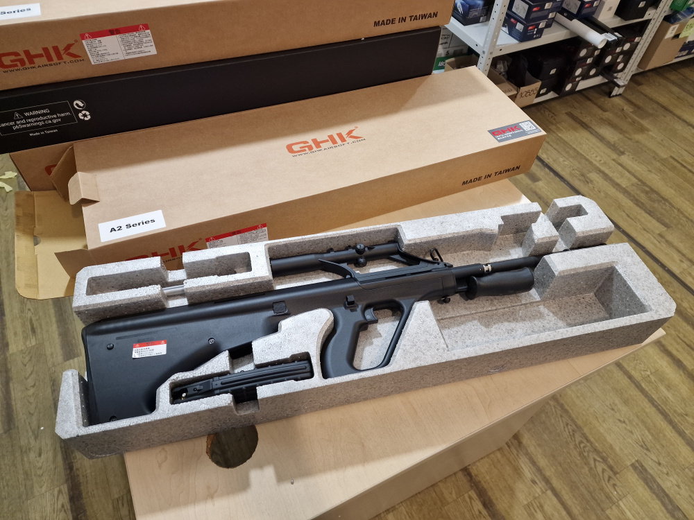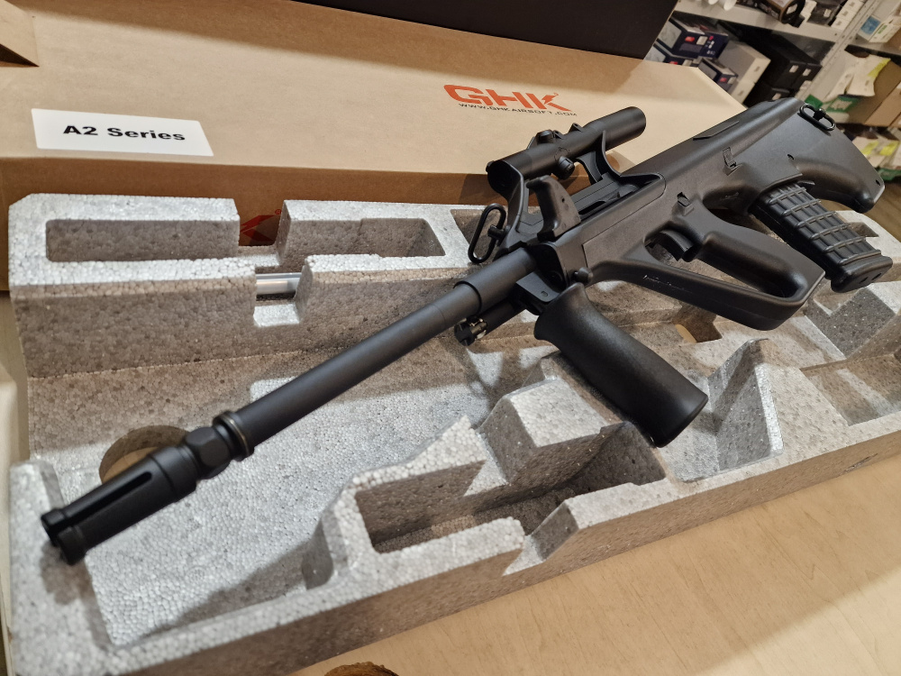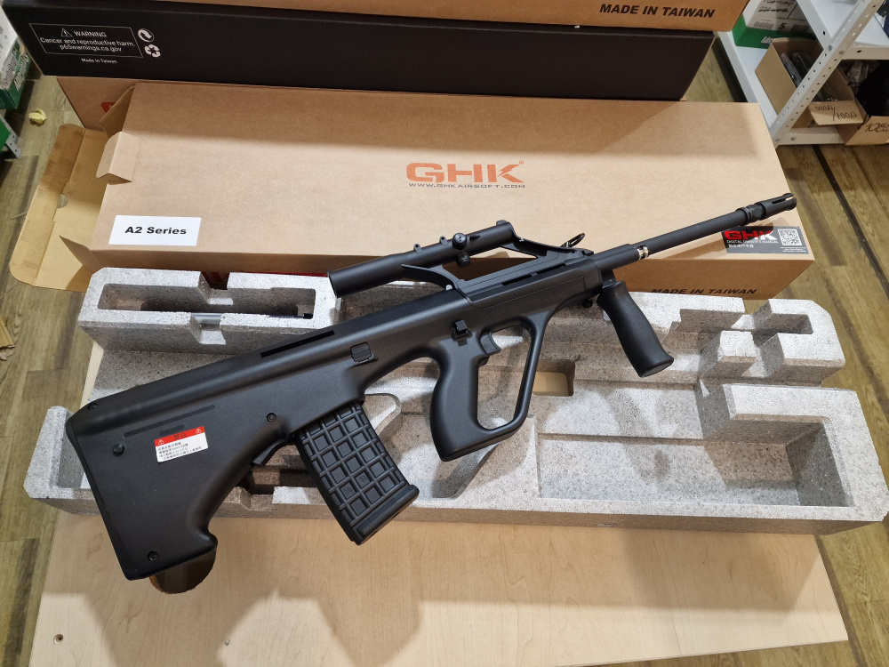 AUG A2 GBB от GHK — впечатляющая штурмовая винтовка с характерной компоновкой «буллпап». Эта винтовка сочетает в себе компактность и высокую производительность, что делает её идеальным выбором как для ближнего боя, так и для полевых охот. Реалистичная система газоотвода и комплектный 1,5-кратный прицел делают её универсальным выбором.