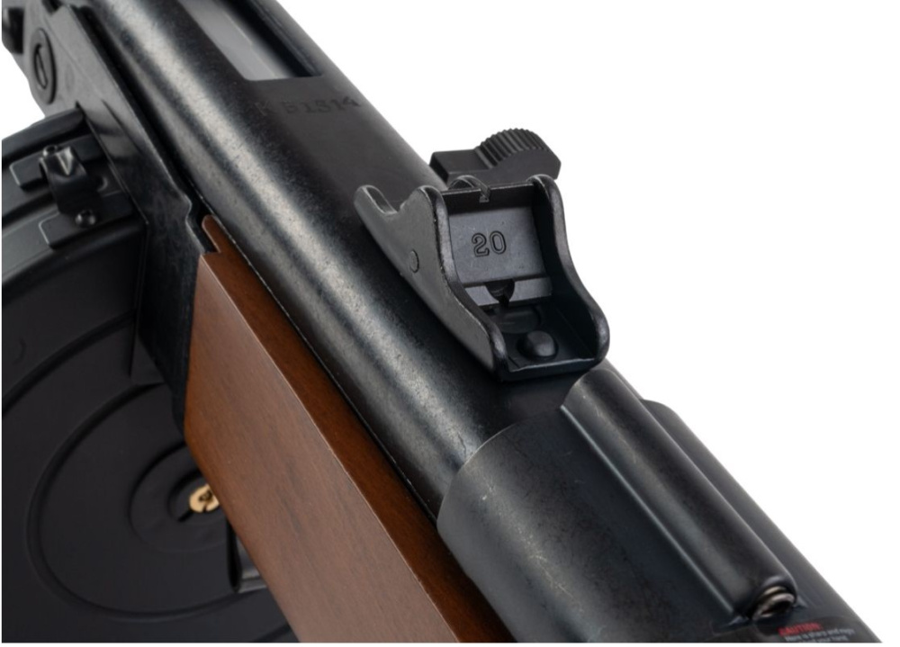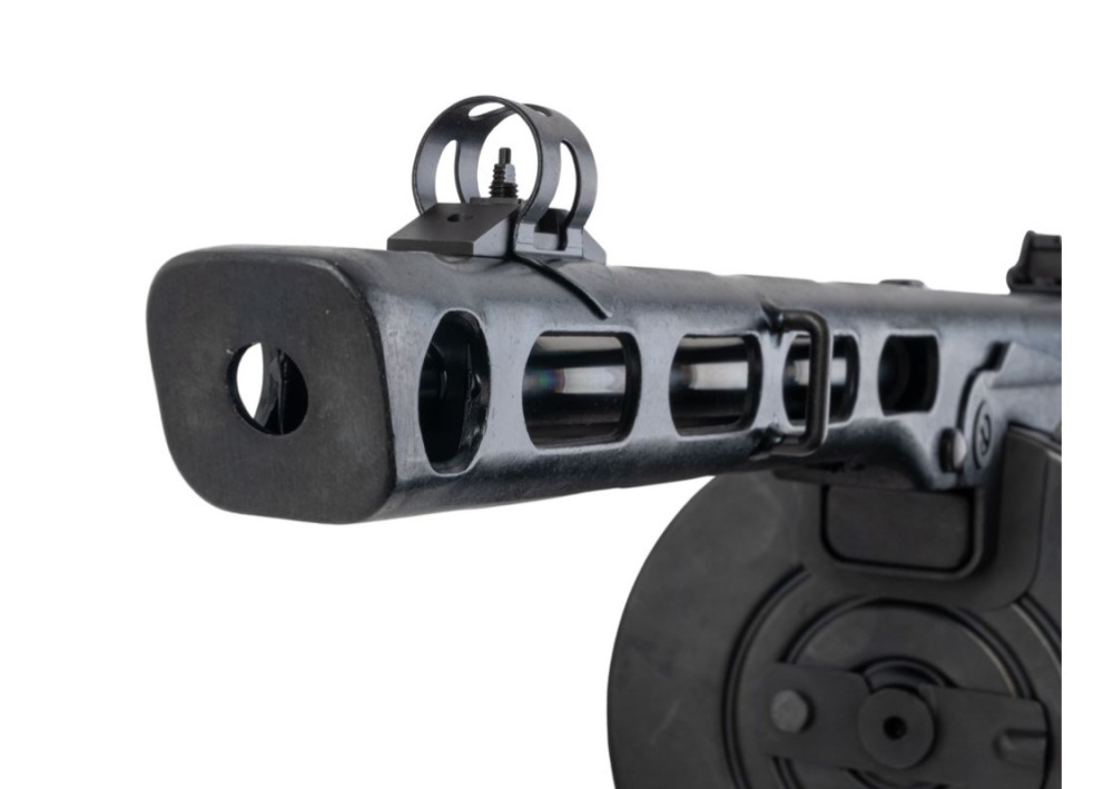 As the inaugural gas blowback PPSh-41, VFC pays tribute to this legendary firearm by meticulously replicating its design, unique mechanics, and authentic feel, closely resembling its real-steel counterpart. The GBB features a realistic weight and is constructed with genuine wood and a stamped, riveted steel body, including its signature 3mm thick stamped steel compensator and drum magazine, which enhance the authentic experience when handling this SMG. Incorporating cutting-edge airsoft technology, VFC has integrated a cleverly designed Top Down Centre (TDC) hop-up system that applies vertical pressure to the BB, resulting in a straighter, longer, and more stable trajectory for each shot. Furthermore, the PPSh is equipped with a two-stage safety mechanism that prioritizes practical ergonomics over aesthetic accuracy, featuring a lock switch on the charging handle that secures the trigger in both the closed and open bolt states to prevent accidental discharges. The fire control system includes an easily accessible semi-auto to full-auto switch located just in front of the trigger.