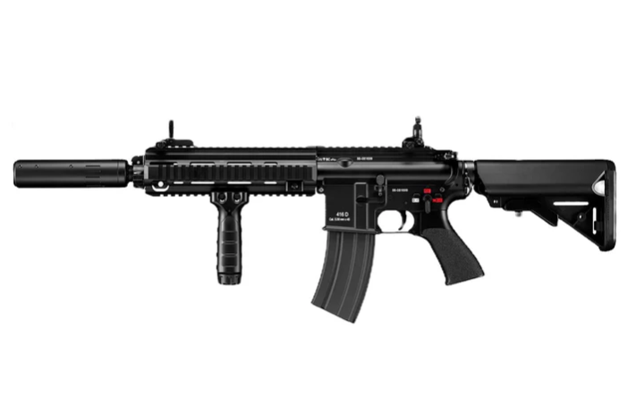 Marui's new DEVGRU version of the standard 416D is based upon the Seal Team 6 variant. It ships with a 145mm long suppressor, a super slim pistol grip, unique ghost iron sights, tactical sling mount where the buffer tube meets the lower receiver and a removable tactical foregrip.