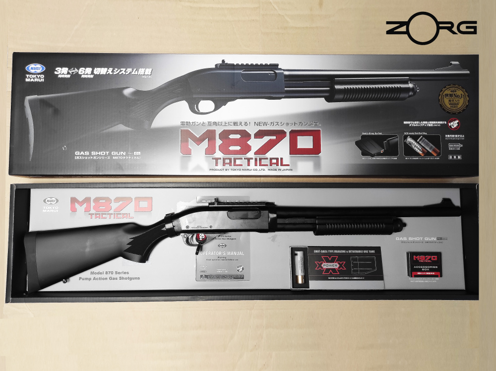 Tokyo Marui invention is a novel new shell based system that allows M870 shotgun to shoot between 3 to 6 BB's at a time. Tthis new M870 also has 3 inner barrels, each equipped with a fixed hop-up. Each shell has a capacity of 30 BBs. The gun only holds one shell at a time, and it only comes with 1 shell on purchase.