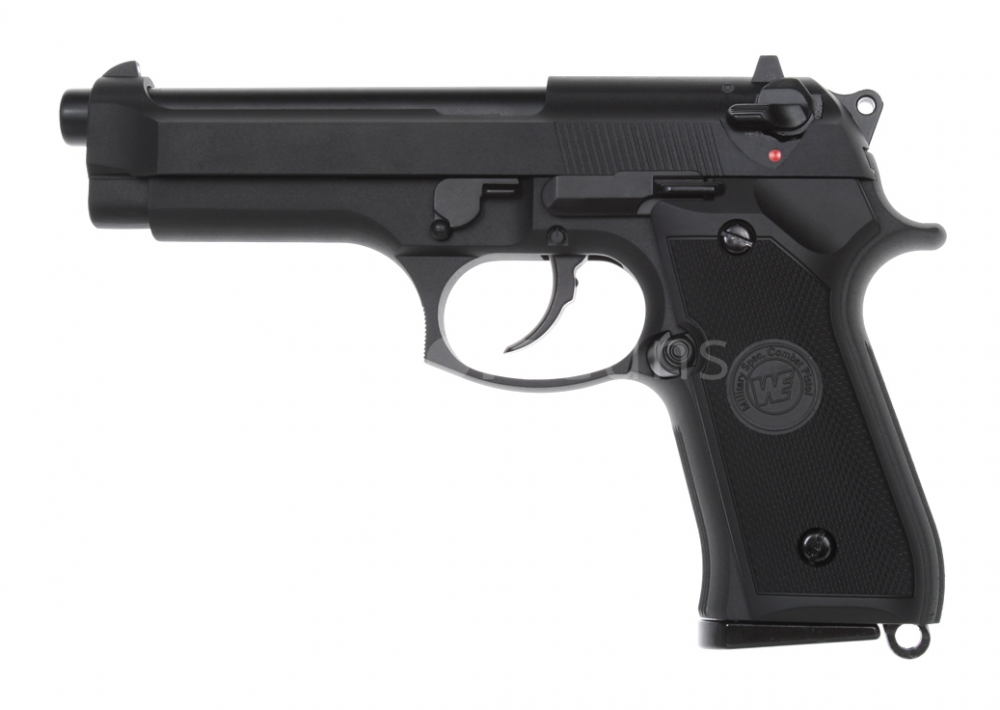 GAS airsoft pistol with Blow Back system. Full metal replica of model Beretta M92 from WE. Known model service pistol, under the name M9, is in firearms performance for years introduced service in the US ARMY. For the most common full-size version Berreta is very typical of a recess on the upper slide. Like any GBB pistols has, among other things realistic disassembly, functional bolt catch and a two-sided SAFE lever on the slide. Pleasant and holding certain to help increase the weight of the model and ingeniously roughened grip on the surface of the grip.