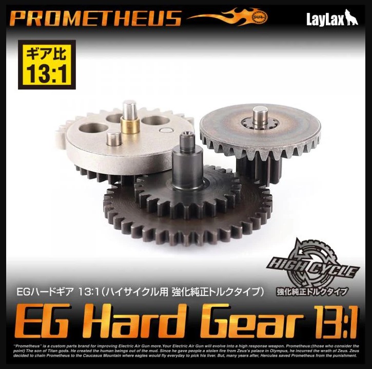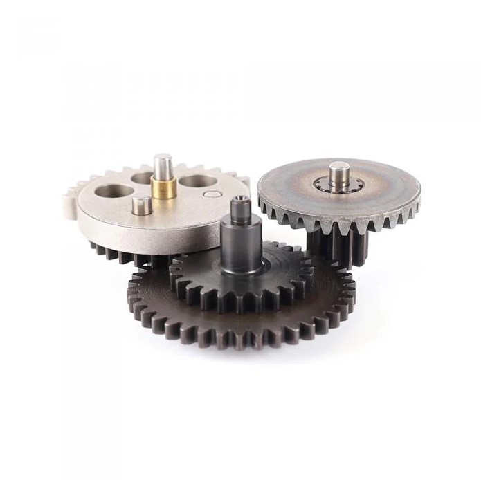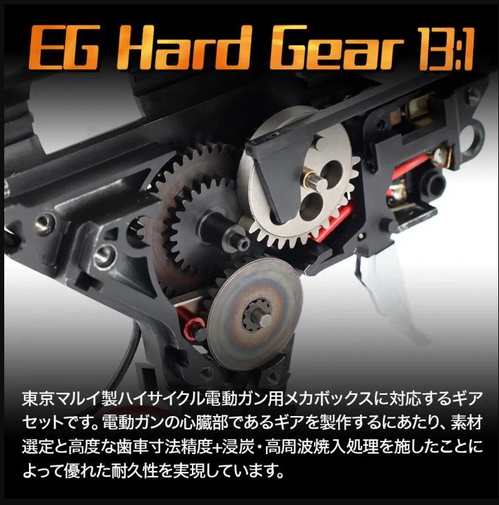 This gear set is compatible with the mechanical box for Tokyo Marui high cycle electric guns. When manufacturing gears, which are the heart of electric guns, we have achieved excellent durability by selecting materials, achieving high gear dimensional accuracy, and applying carburizing and induction hardening treatments. Furthermore, we have designed products from a variety of usage perspectives, such as increasing the number of latch teeth to reduce the reverse load when gear stops, and we support a wide variety of custom settings with a lineup tailored to spring rates and cycle speeds. The number of latch teeth to prevent reverse rotation is set to 10, which also contributes to improving the response of semi-auto shooting.
