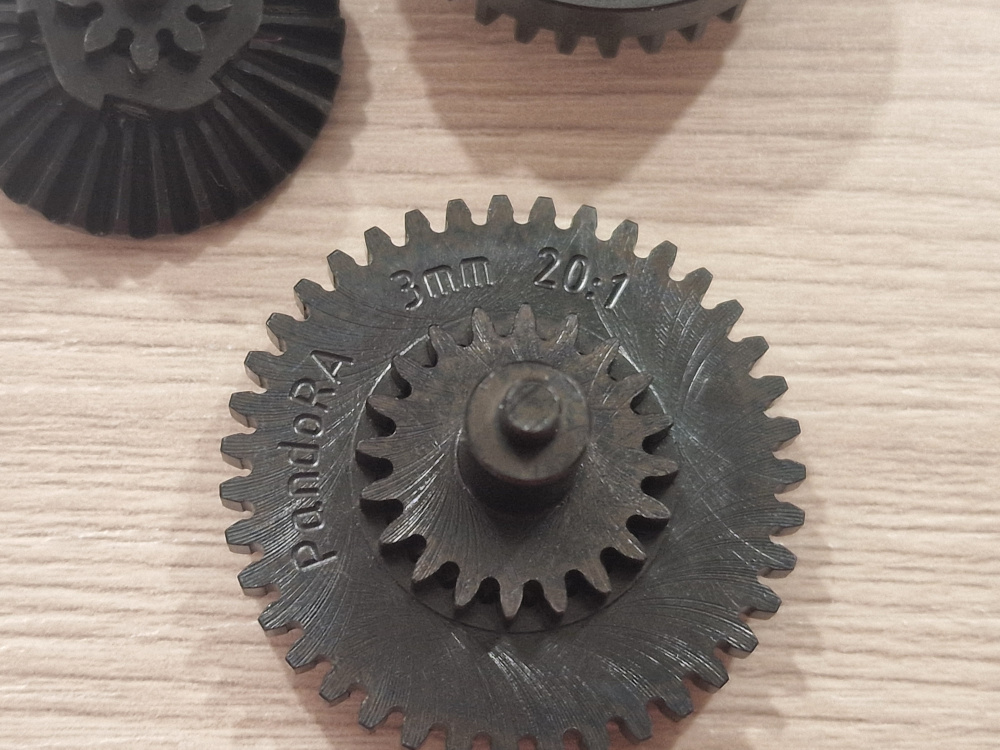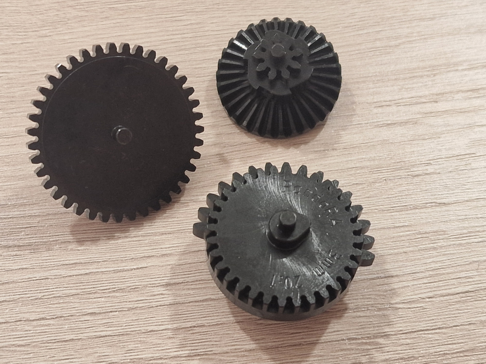 Комплект прецизионных шестерен для страйкбольного оружия, изготовленных методом ЧПУ-обработки из высококачественной закаленной стали.