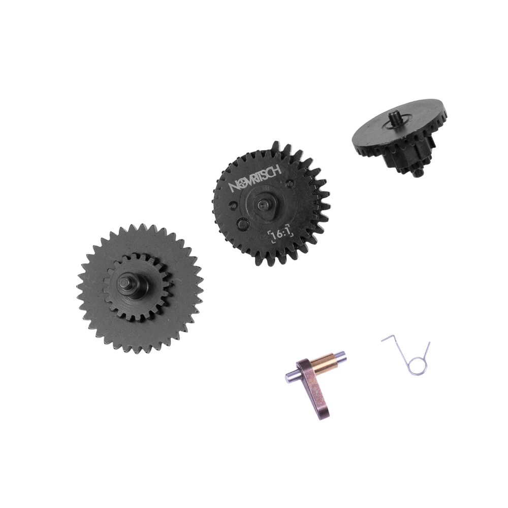Запасной усиленный комплект шестерен 16:1 для страйкбольной винтовки SSR63. Изготовлен методом фрезеровки на станке с ЧПУ из стали для длительного срока службы.
