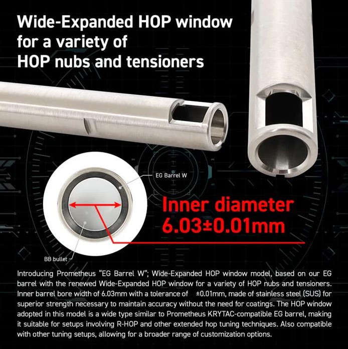Inner barrel bore width of 6.03mm with a tolerance of ±0.01mm, made of stainless steel (SUS) for superior strength necessary to maintain accuracy without the need for coatings. The HOP window adopted in this model is a wide type similar to Prometheus KRYTAC-compatible EG barrel, making it suitable for setups involving R-HOP and other extended hop tuning techniques. Also compatible with other tuning setups, allowing for a broader range of customization options.